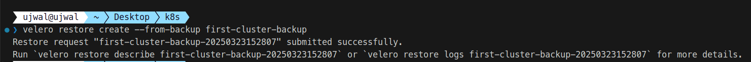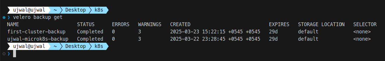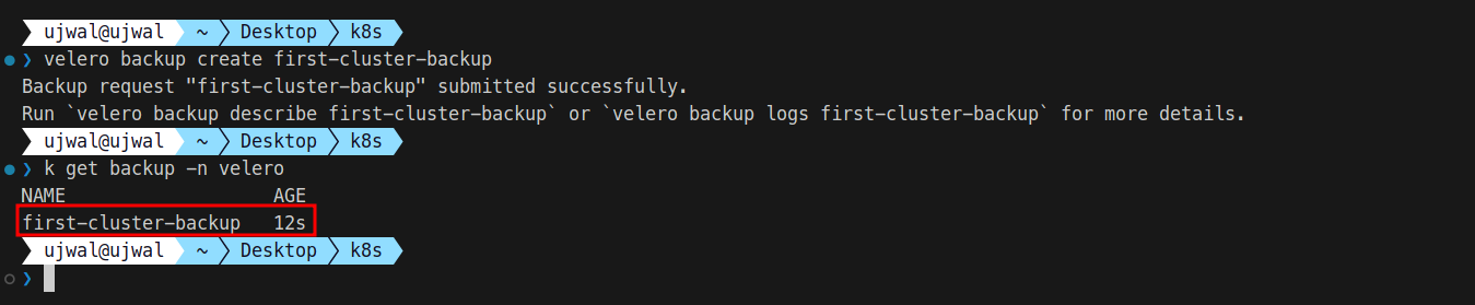 Once the backup location is correctly set up, create a full backup of the Kubernetes cluster by executing: