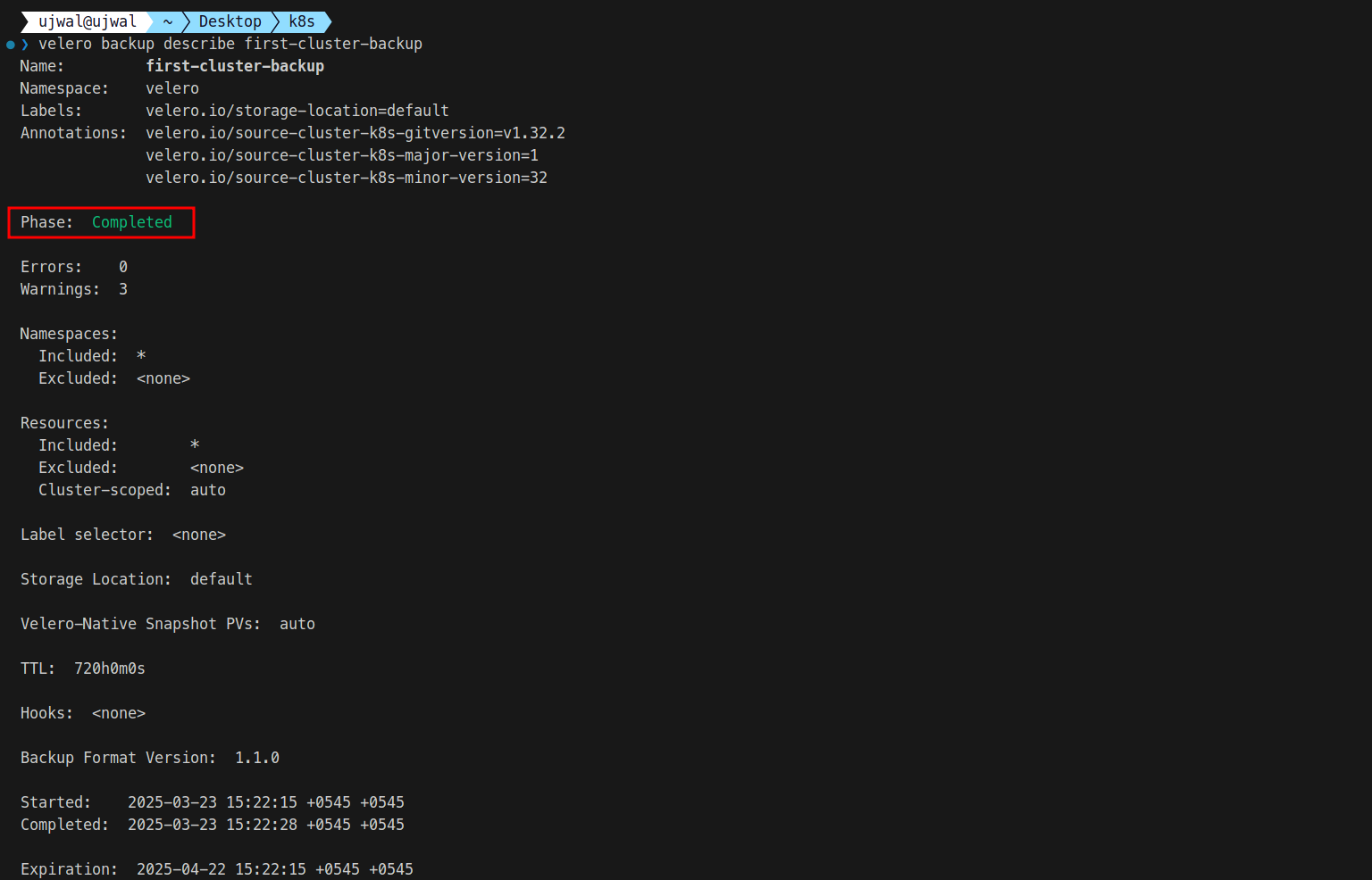 Tip: By default, Velero retains backups for 30 days (720 hours). To modify the retention period, use the –ttl <DURATION> flag, specifying the desired duration (e.g., –ttl 7d for 7 days).