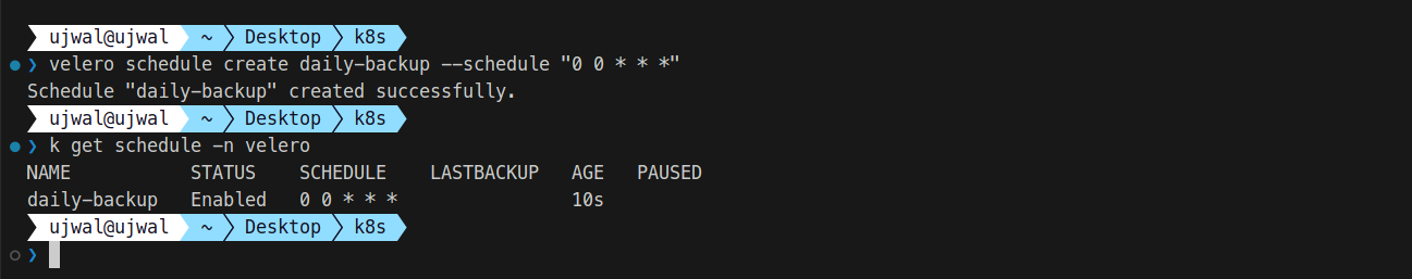 velero schedule create daily-backup --schedule "0 0 * * *"