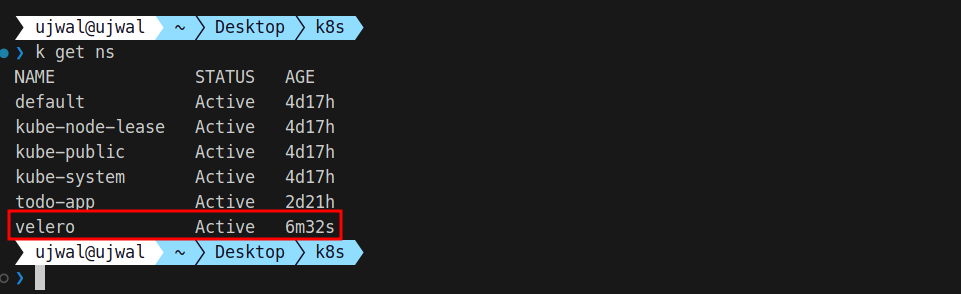 Once Velero is installed in your Kubernetes cluster, it will automatically create a namespace to handle all backup and restore operations. To verify the namespaces in your cluster, run: