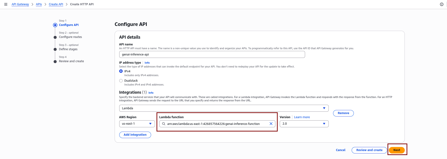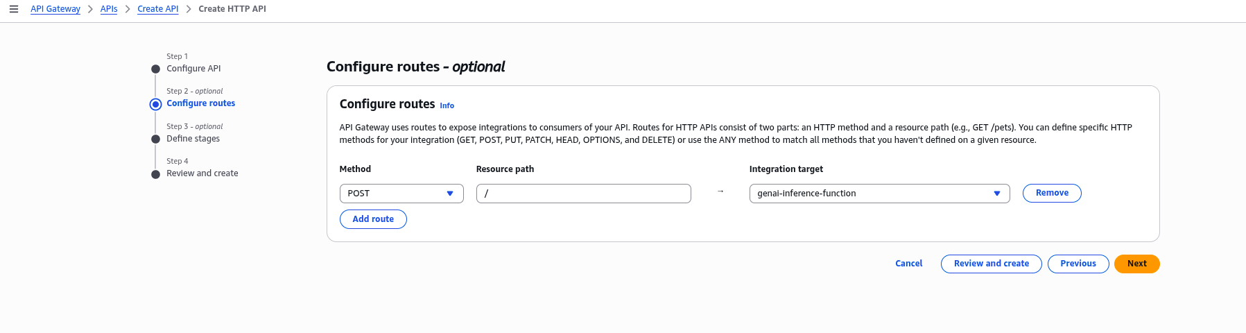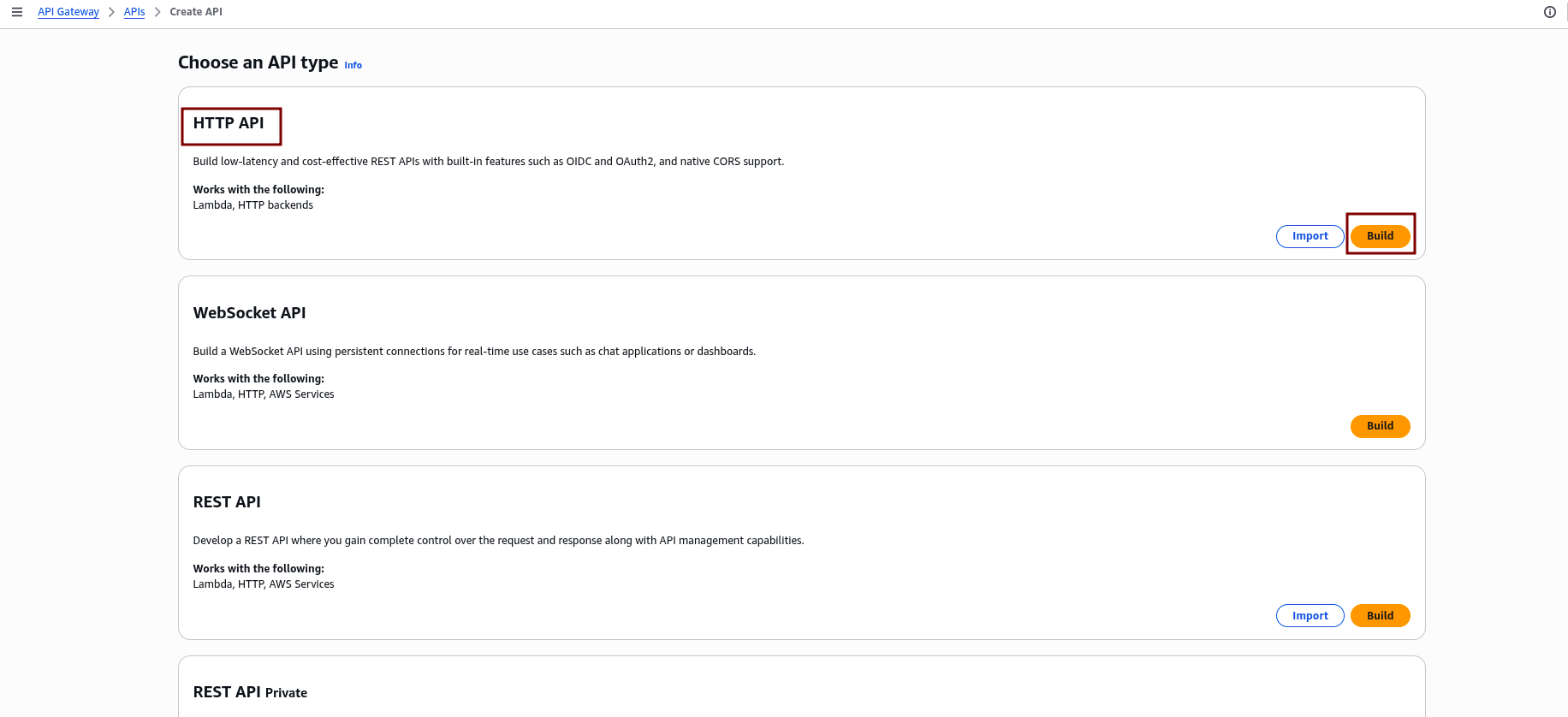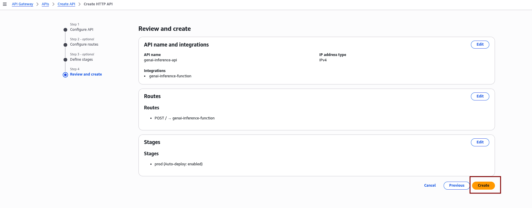 Carefully review all the configured API settings, including routes, integrations, and stage details. Once confirmed, click “Create” to finalize and deploy your API.