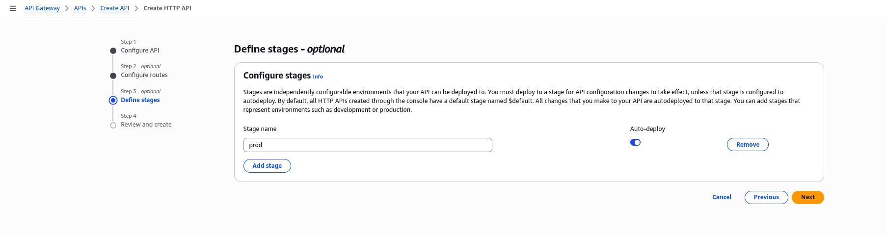 In the Configure stages section, name your deployment stage (for example, prod), and click “Next” to proceed.
