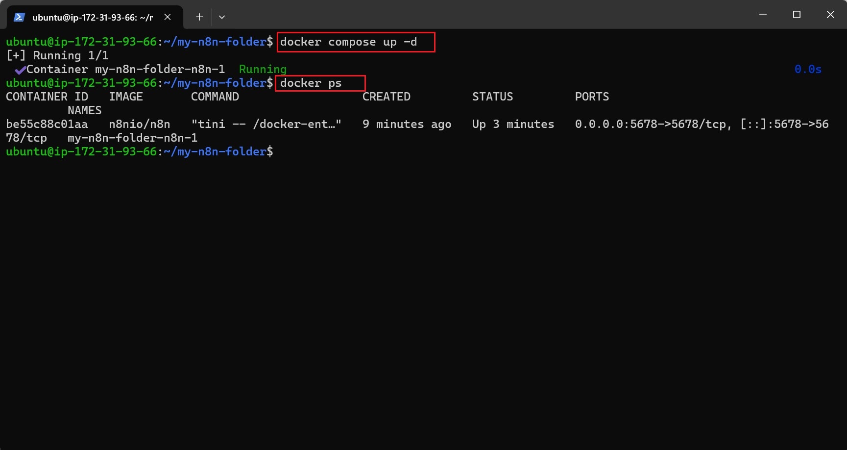Inside the directory where docker-compose.yml and .env files are located, run the following command to start the n8n container: