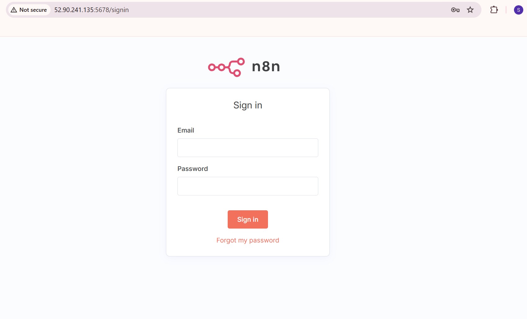 - Once entered in the browser, the n8n interface will load. It typically begins with the sign-in or setup screen, followed by access to the workflow dashboard.