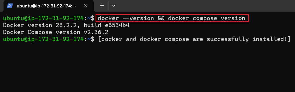 With the EC2 instance up and connected via SSH, run the following commands inside the terminal to install Docker and Docker Compose: