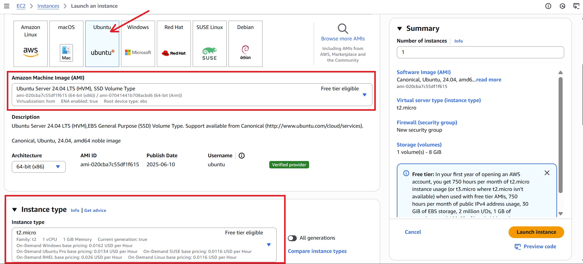 - Select an instance type suitable for your workload (for example, t2.micro for this tutorial).