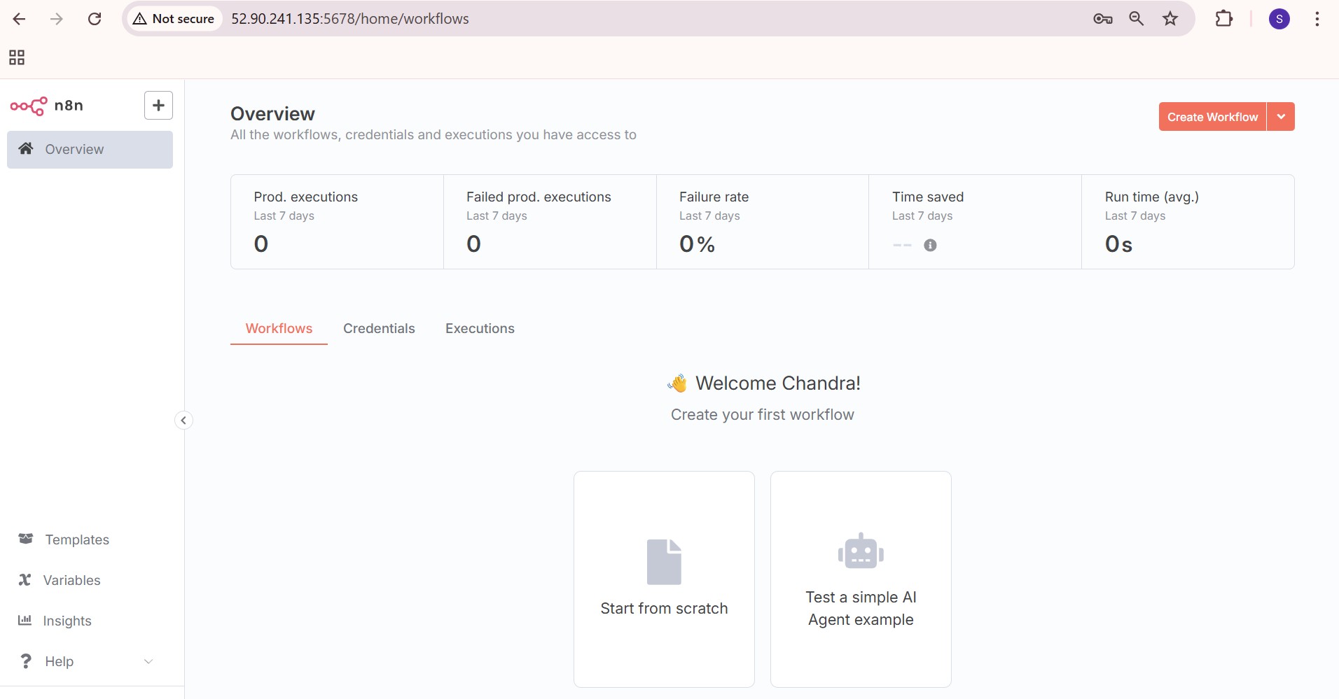 - After the container is up and running, the n8n web interface can be accessed from the browser with the following URL: