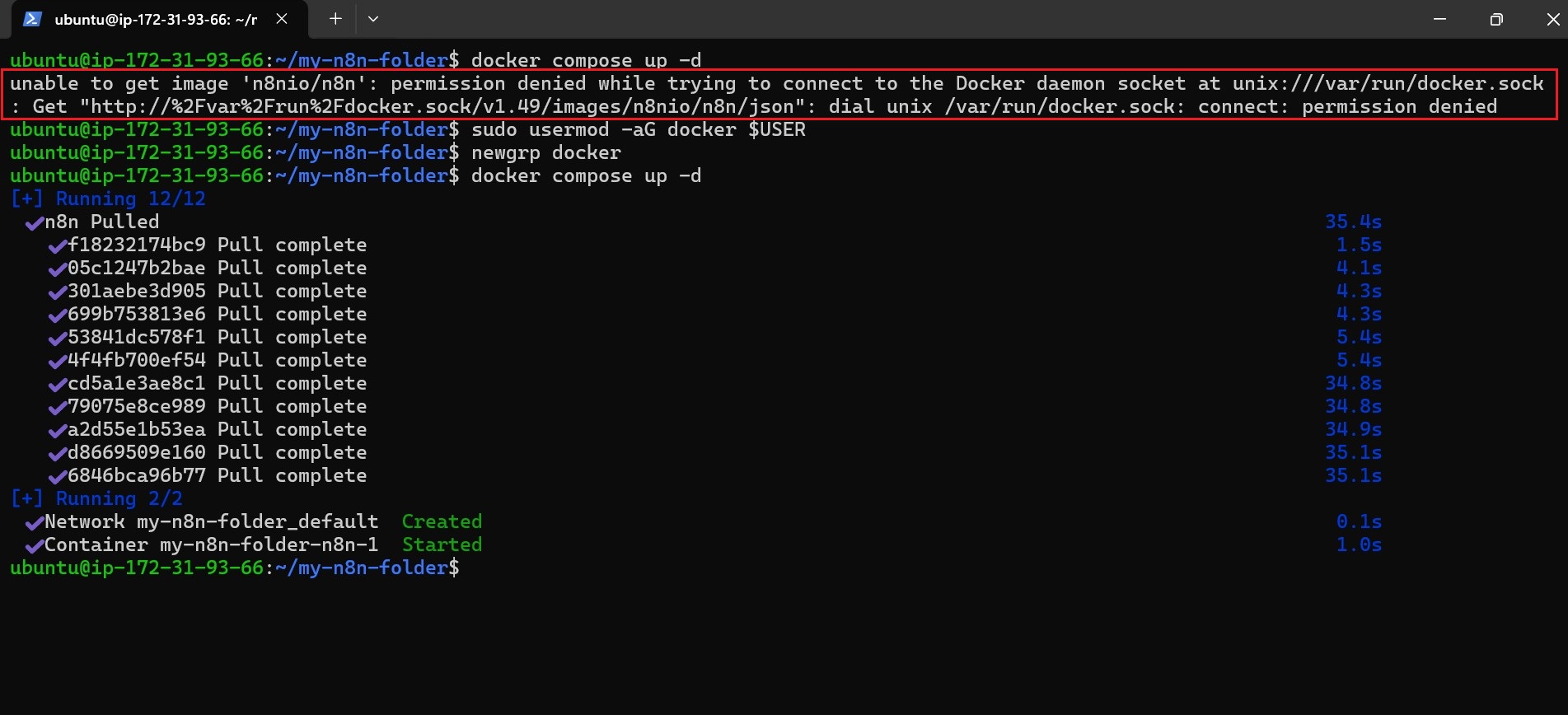 Sometimes, even if the container is running, the n8n dashboard may remain inaccessible due to file permission issues. To resolve this, run: