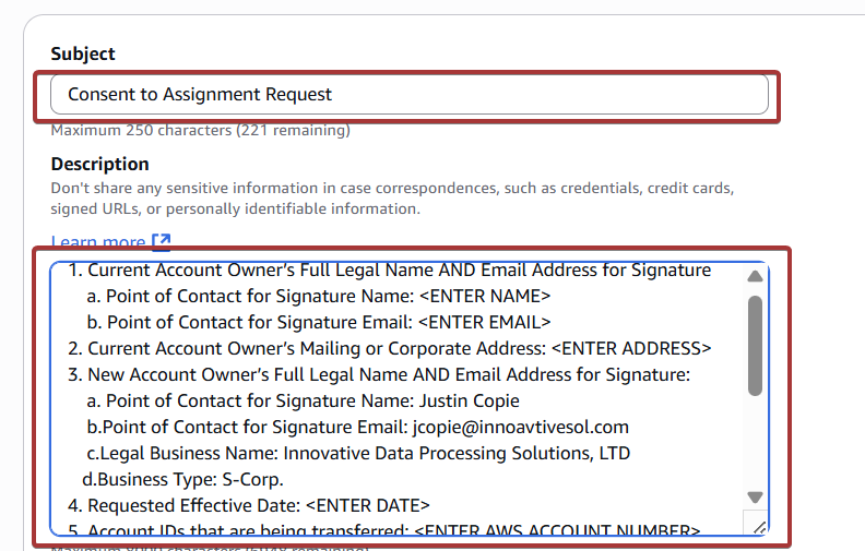 5. AWS Account ID(s) being transferred: <ENTER ACCOUNT ID(S)>