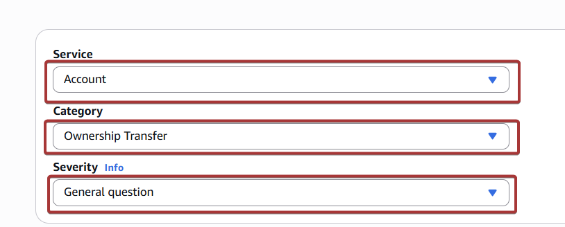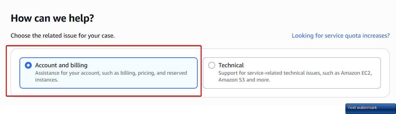 • Select “Account and billing” support from the available options. This directs the request to the AWS team responsible for account ownership and billing matters.