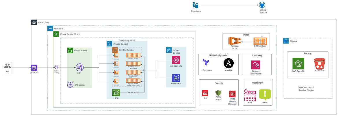 - Amazon EFS: Amazon EFS is used for shared, persistent storage across multiple ECS tasks and EC2 instances, simplifying data management and ensuring data durability.Security Best Practices: Implemented strong security measures, including IAM roles with least-privilege access, security groups to control network traffic, and encryption of sensitive data at rest and in transit.