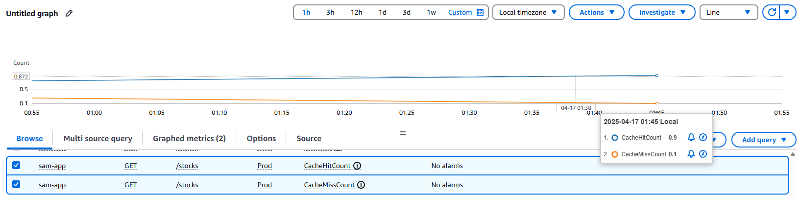 In addition to Postman tests, CloudWatch metrics confirm real-world cache performance, showing optimal utilization with a 9:1 hit-to-miss ratio.