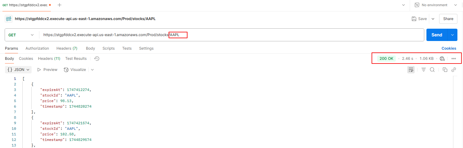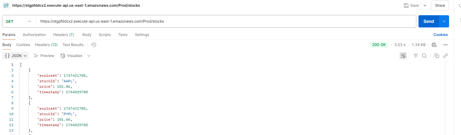 GETrequest to the/stocksendpoint. - Expected Behavior: Higher latency (~3.03 seconds) as API Gateway routes the request to Lambda, which queries DynamoDB; the response is then cached.