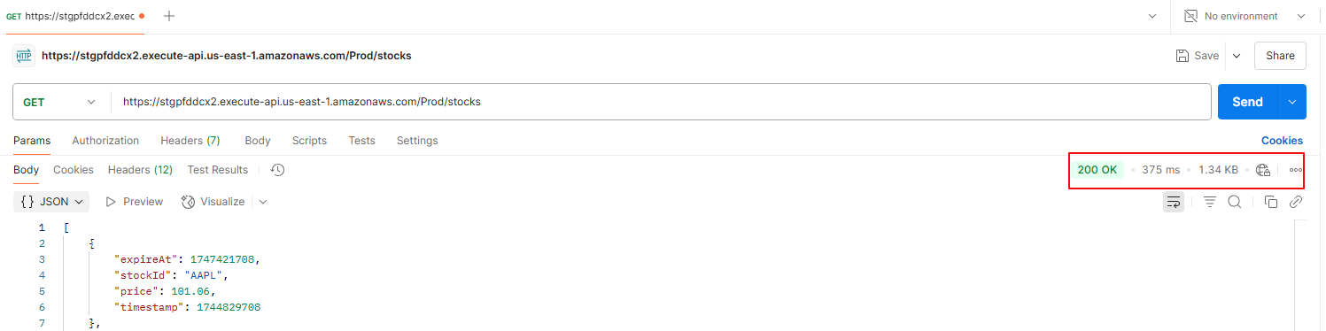 GETrequest to the/stocksagain within the 1-minute TTL period. - Expected Behavior: Much lower latency (~375 ms) as API Gateway serves the response from cache, bypassing Lambda and DynamoDB.